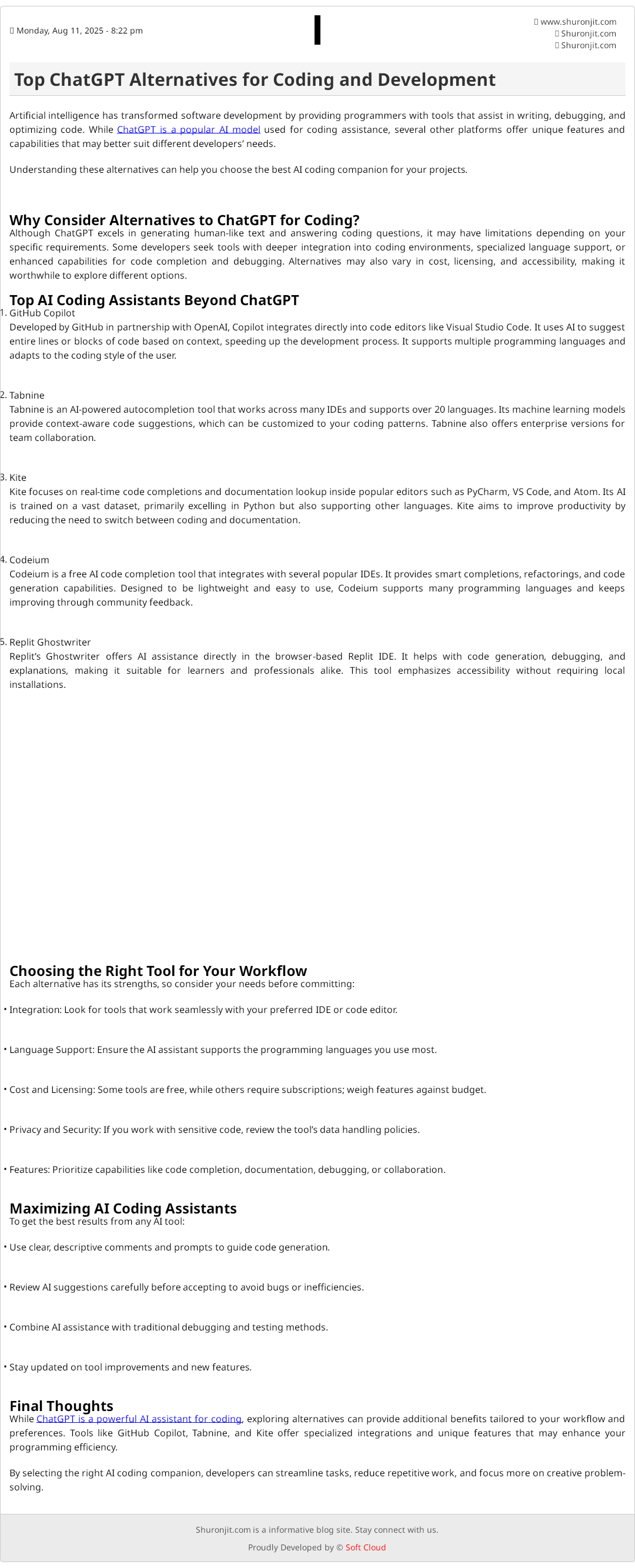 Artificial intelligence has transformed software development by providing programmers with tools that assist in writing, debugging, and optimizing code. While ChatGPT is a popular AI model used for coding assistance, several other platforms offer unique features and capabilities that may better suit different developers’ needs.