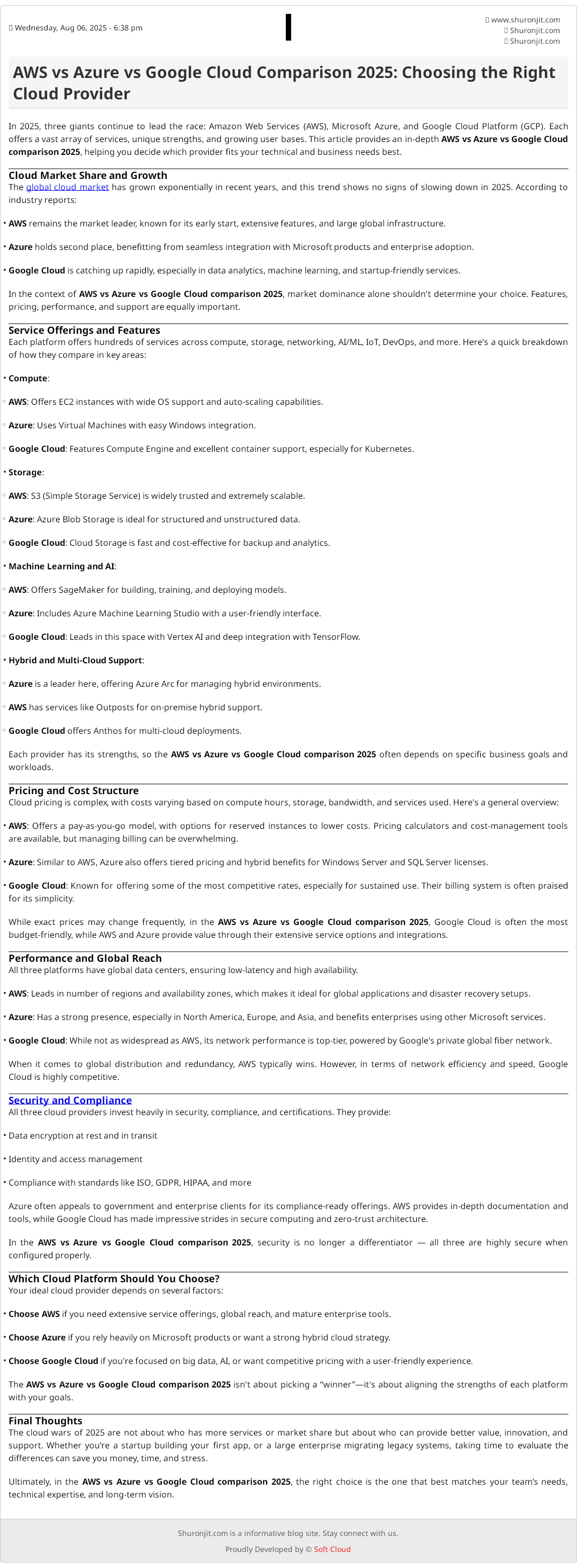 In 2025, three giants continue to lead the race: Amazon Web Services (AWS), Microsoft Azure, and Google Cloud Platform (GCP). Each offers a vast array of services, unique strengths, and growing user bases. This article provides an in-depth AWS vs Azure vs Google Cloud comparison 2025, helping you decide which provider fits your technical and business needs best.