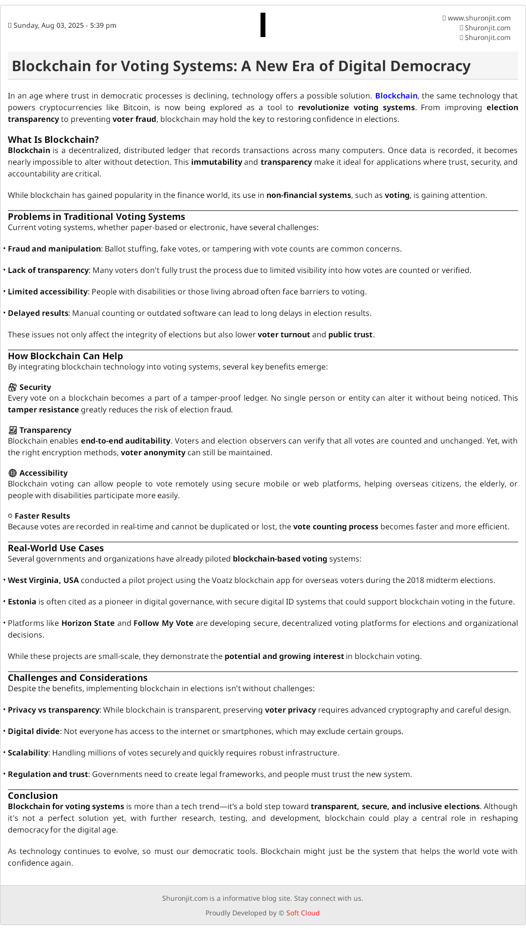 Blockchain for voting systems is more than a tech trend—it’s a bold step toward transparent, secure, and inclusive elections. Although it's not a perfect solution yet, with further research, testing, and development, blockchain could play a central role in reshaping democracy for the digital age.
