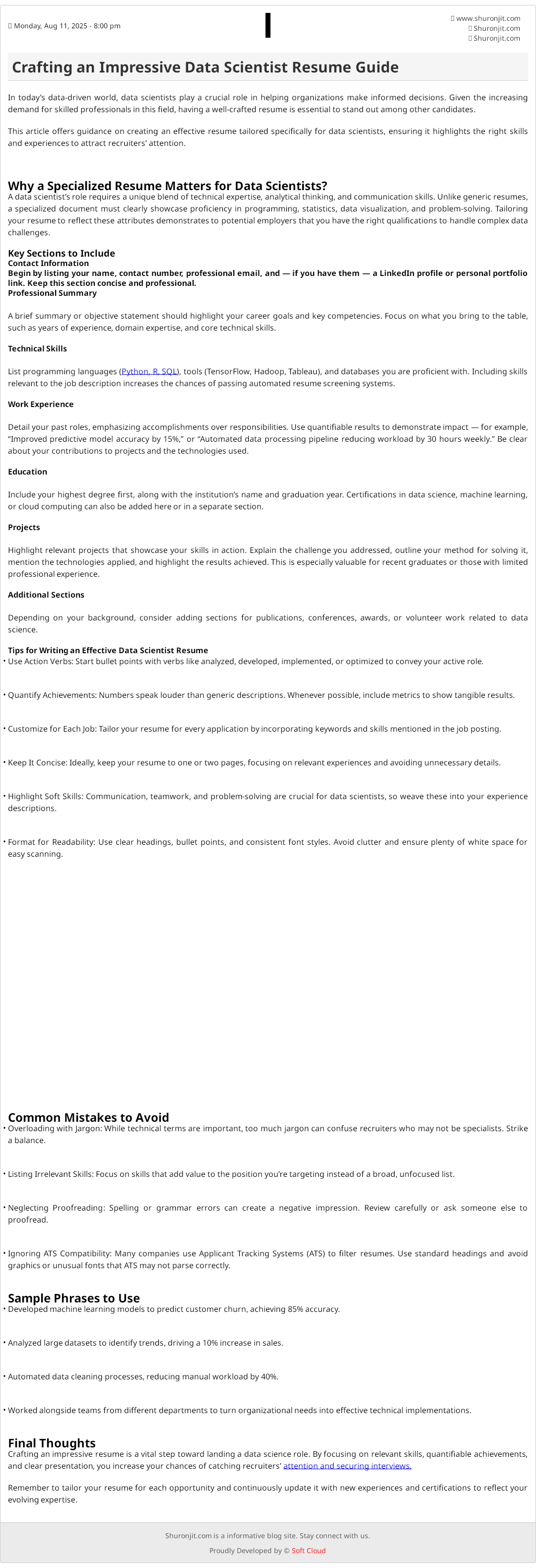 Crafting an impressive resume is a vital step toward landing a data science role. By focusing on relevant skills, quantifiable achievements, and clear presentation, you increase your chances of catching recruiters’ attention and securing interviews.