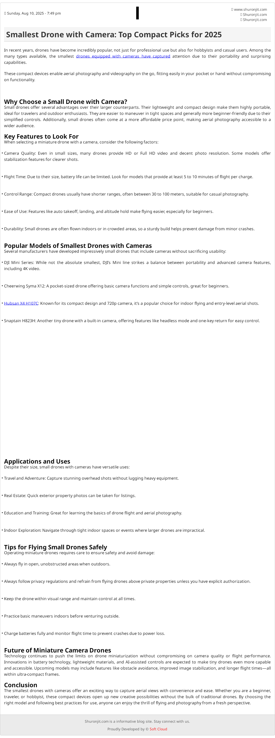 The smallest drones with cameras offer an exciting way to capture aerial views with convenience and ease. Whether you are a beginner, traveler, or hobbyist, these compact devices open up new creative possibilities without the bulk of traditional drones. By choosing the right model and following best practices for use, anyone can enjoy the thrill of flying and photography from a fresh perspective.