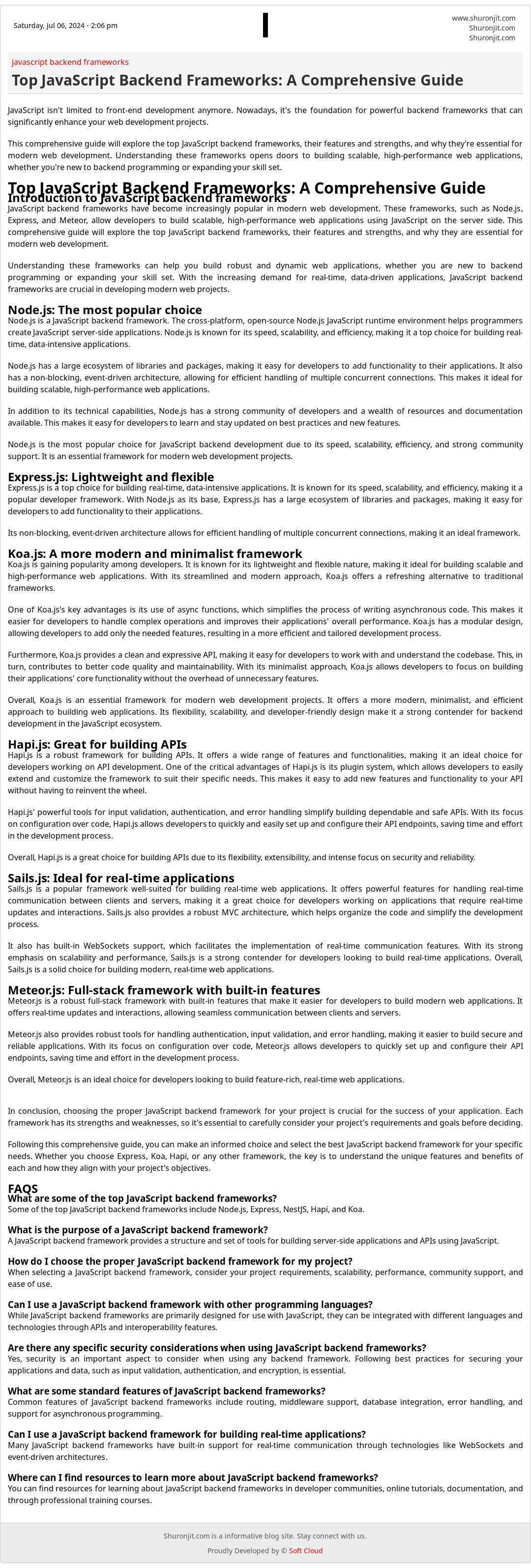 Following this comprehensive guide, you can make an informed choice and select the best JavaScript backend framework for your specific needs. Whether you choose Express, Koa, Hapi, or any other framework, the key is to understand the unique features and benefits of each and how they align with your project's objectives.