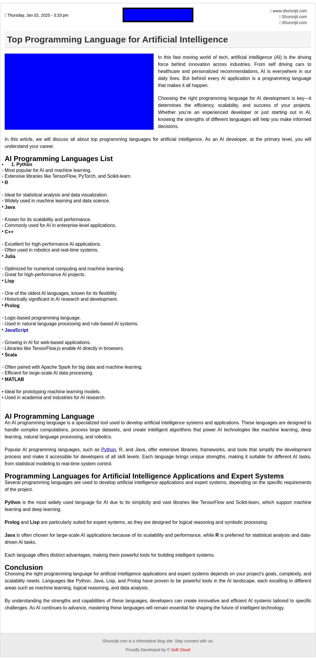 An AI programming language is a specialized tool used to develop artificial intelligence systems and applications. These languages are designed to handle complex computations, process large datasets, and create intelligent algorithms that power AI technologies like machine learning, deep learning, natural language processing, and robotics.