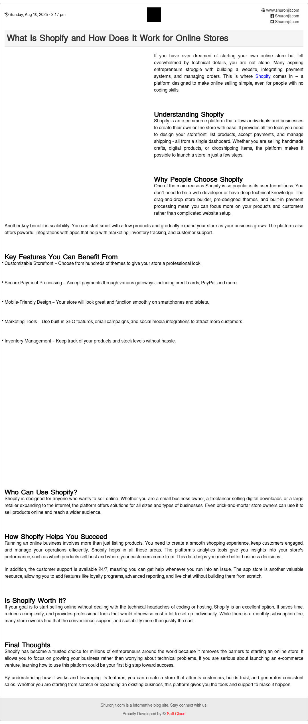 If your goal is to start selling online without dealing with the technical headaches of coding or hosting, Shopify is an excellent option. It saves time, reduces complexity, and provides professional tools that would otherwise cost a lot to set up individually. While there is a monthly subscription fee, many store owners find that the convenience, support, and scalability more than justify the cost.